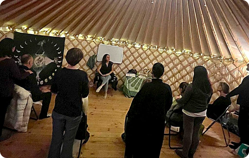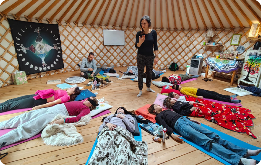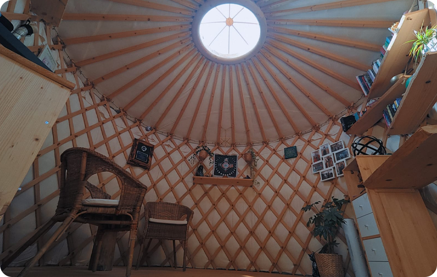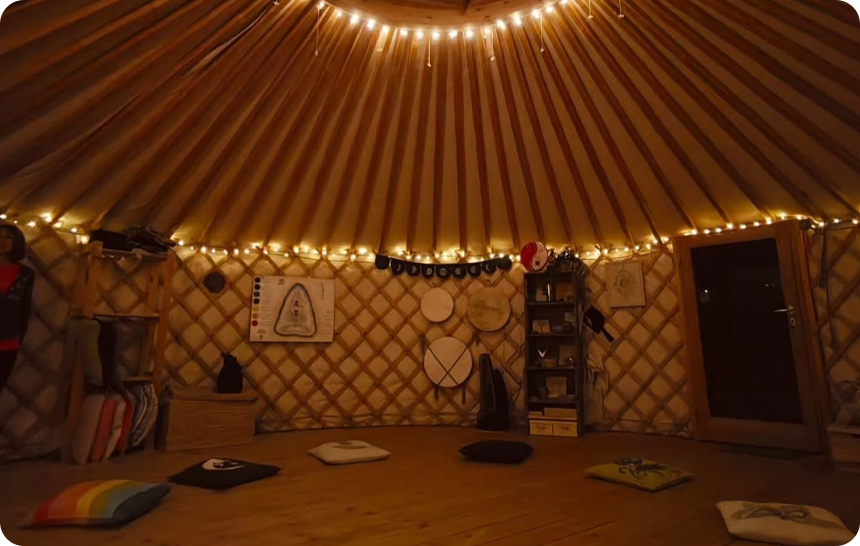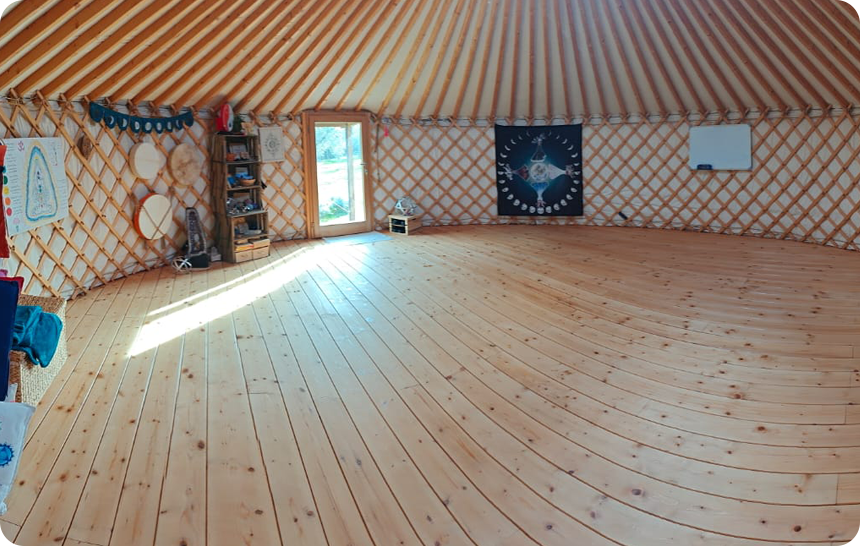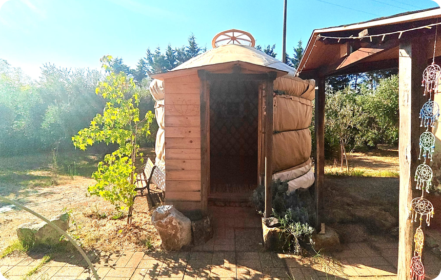 La yurta è una struttura di origine mongola che i nomadi delle sterpe utilizzano come abitazione, è una tenda con una struttura in legno autoportante e non ci sono viti o colle che la tengono insieme ma soltanto la struttura in se e i vari incastri nel legno della cupola. La tenda è formata da quattro strati che permettono di isolarla dal caldo dal freddo e che facilitano anche il passaggio di aria e il riscaldamento nei mesi più freddi. Le strutture europee sono state leggermente modificate ed alzate rispetto alle originali mongole per permettere un più facile accesso e grazie anche al clima più stabile e meno rigido. Lo spazio della yurta grande è aperto e condiviso anche con altri operatori che portano le loro conoscenze e competenze nel nostro spazio per offrire un’ampia gamma di possibilità di evolvere e crescere per ognuno.