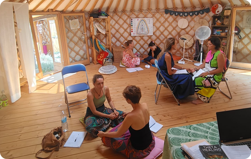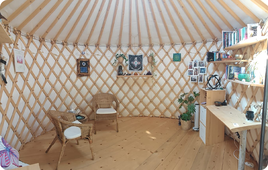 Quando ho intrapreso la scelta di svolgere il lavoro da operatrice olistica in modo professionale, volevo che si tenesse in uno spazio completamente naturale, in armonia con un ambiente lontano dal caos urbano. Un caro amico mi consigliò la struttura della yurta e me ne sono subito innamorata, così finalmente nel 2021 sono riuscita a realizzarla tra gli olivi e perfettamente in armonia con l’ambiente intorno. E’ uno spazio magico, accogliente, armonioso e luminoso, ideale per ospitare corsi olistici, incontri di gruppo, cerchi, meditazioni e pratiche condivise. La sua forma circolare favorisce l'energia del gruppo, stimola la connessione e crea un’atmosfera di apertura e ascolto. Il pavimento in legno naturale, la luce soffusa e i dettagli curati rendono questo spazio un vero tempio per il lavoro interiore. Nel 2023 è stata realizzata accanto la seconda yurta, più piccola che accoglie le sessioni individuali. Intima, protetta e silenziosa, è perfetta per incontri riservati, trattamenti, letture energetiche o momenti di introspezione profonda. Qui ogni persona può sentirsi ascoltata, sostenuta e al sicuro nel proprio percorso personale.