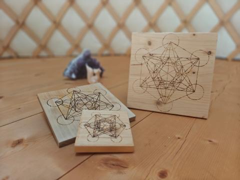 Inciso su legno naturale, il Cubo di Metatron diventa uno strumento attivo: il legno, vivo e connesso all’energia della Terra, amplifica le qualità di protezione e riequilibrio del simbolo.